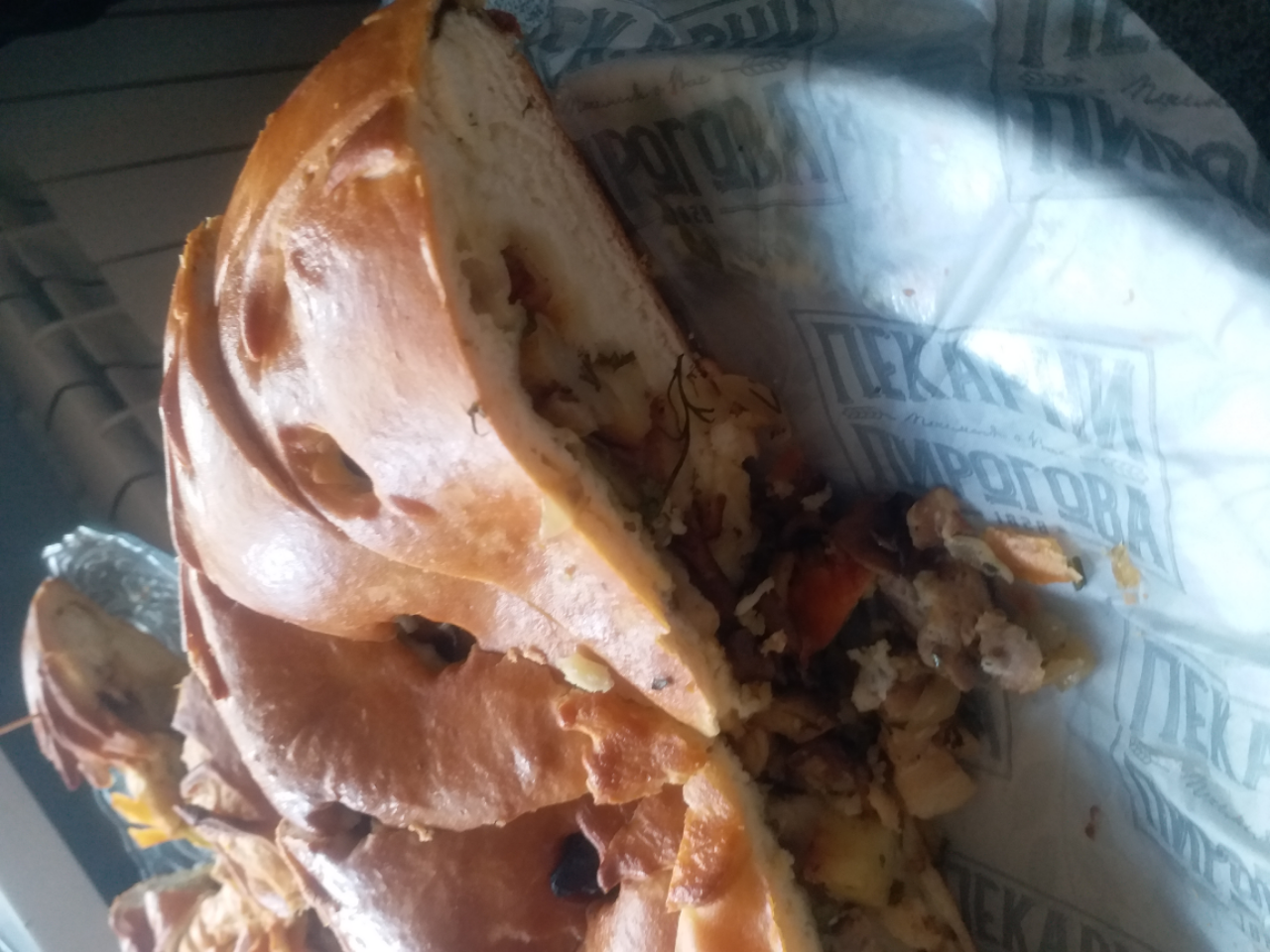 Состав: фирменное тесто, картофель по-деревенски, со шкварками, жареными грибами, тмином и кориандром