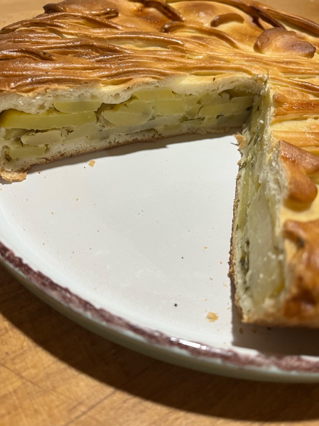 Состав: дрожжевое тесто, картофель, маринованный лук, рыбная консерва-сайра
