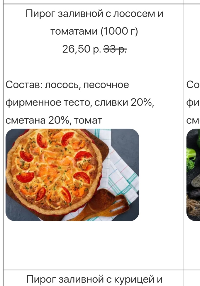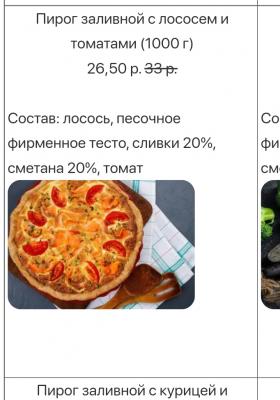 Пирог заливной с лососем и томатами (1000 г) 26,50 р. 33 р. Состав: лосось, песочное фирменное тесто, сливки 20%, сметана 20%, томат ![]()