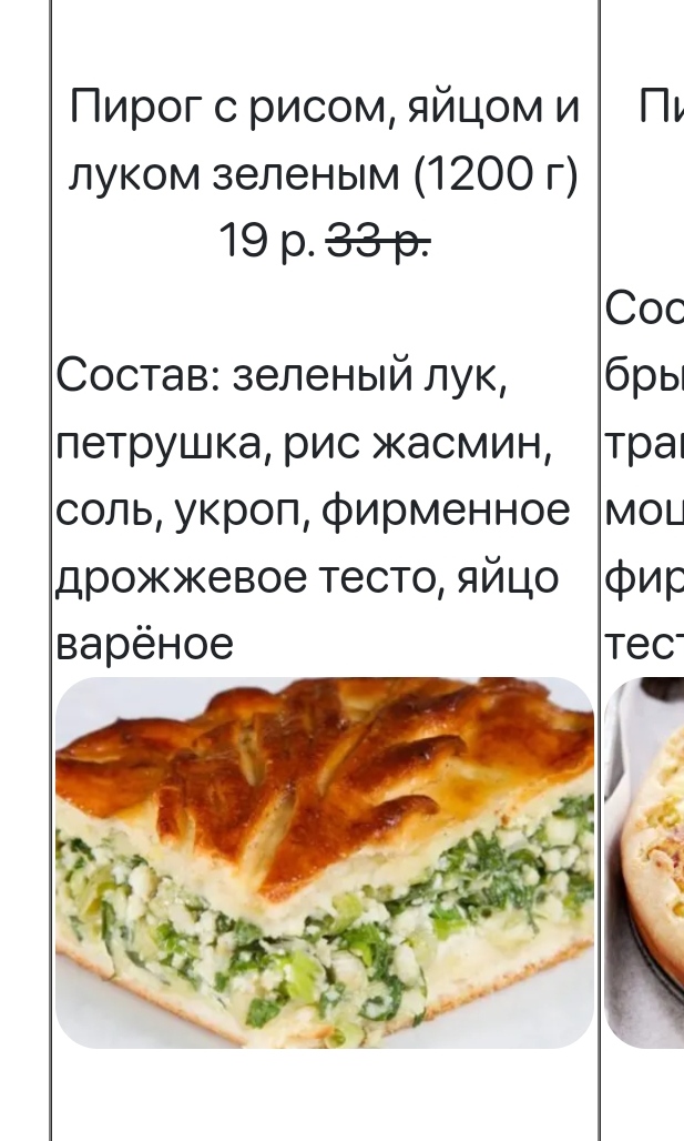 Пирог с рисом, яйцом и луком зеленым (1200 г) 19 р. 33 р. Состав: зеленый лук, петрушка, рис жасмин, соль, укроп, фирменное дрожжевое тесто, яйцо варёное