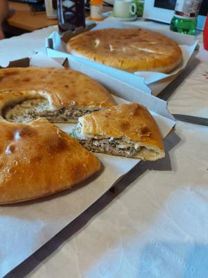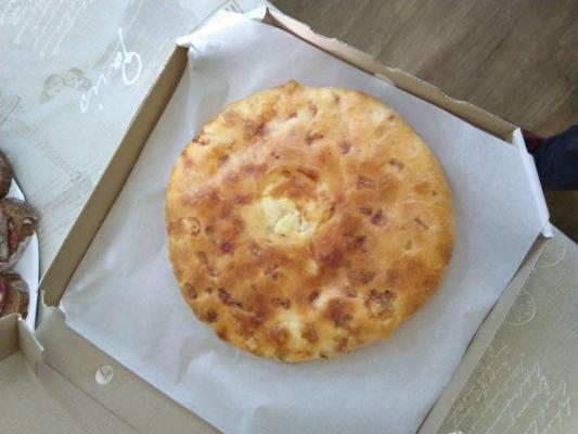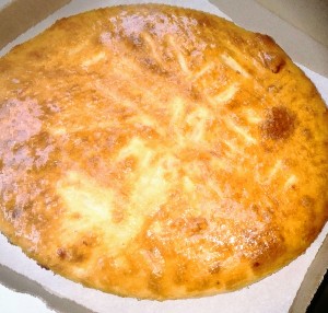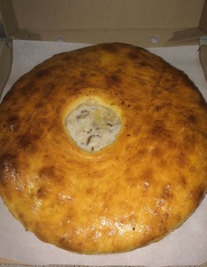 - закрытый пирог с творогом, сыром и чесноком (900 г): дрожжевое тесто, сулугуни, творог, яйца, чеснок, сливочное масло, соль, черный молотый перец