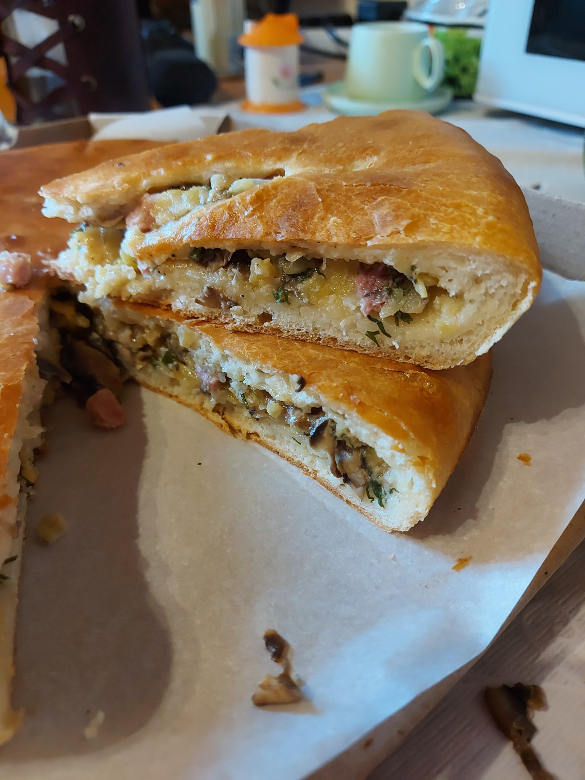 - закрытый пирог с сыром и ветчиной (900 г): дрожжевое тесто, сулугуни, ветчина, сливочное масло