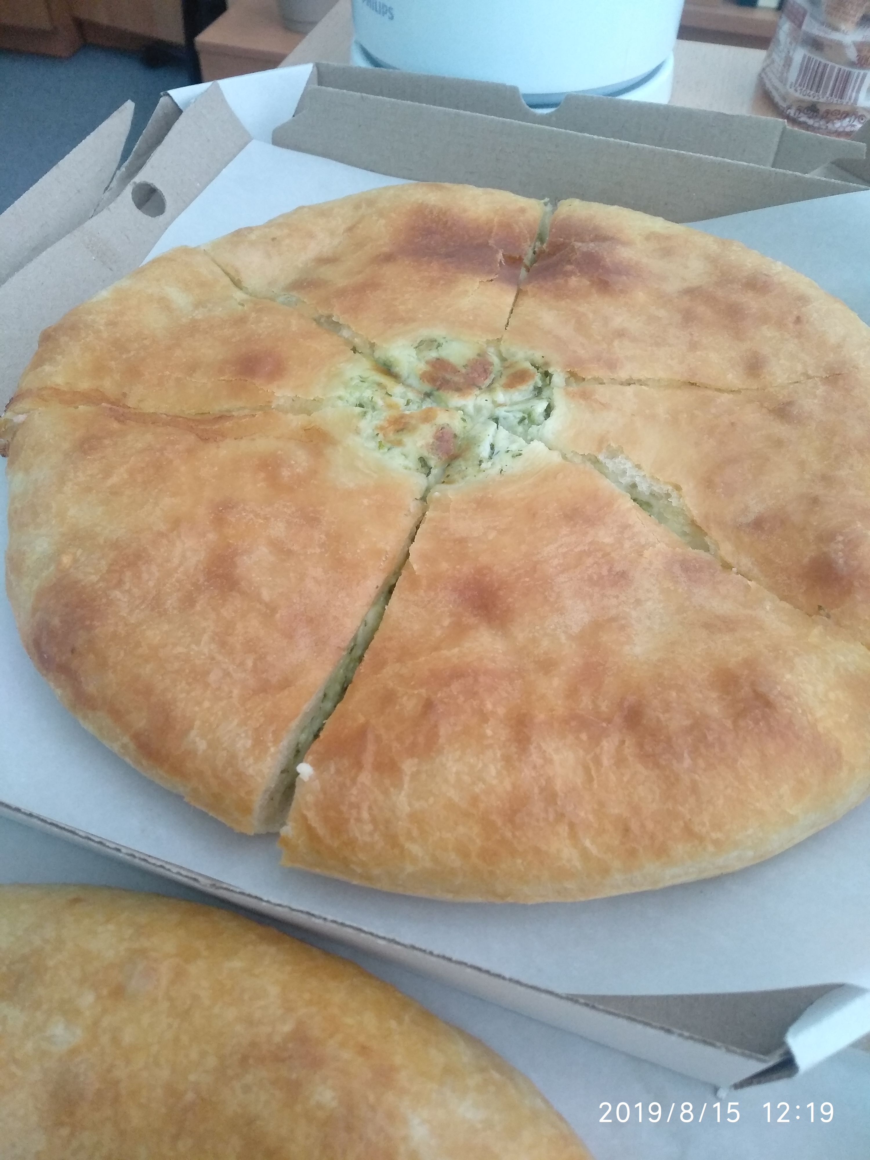 - закрытый пирог с творогом, сыром и чесноком (900 г): дрожжевое тесто, сулугуни, творог, яйца, чеснок, сливочное масло, соль, черный молотый перец
