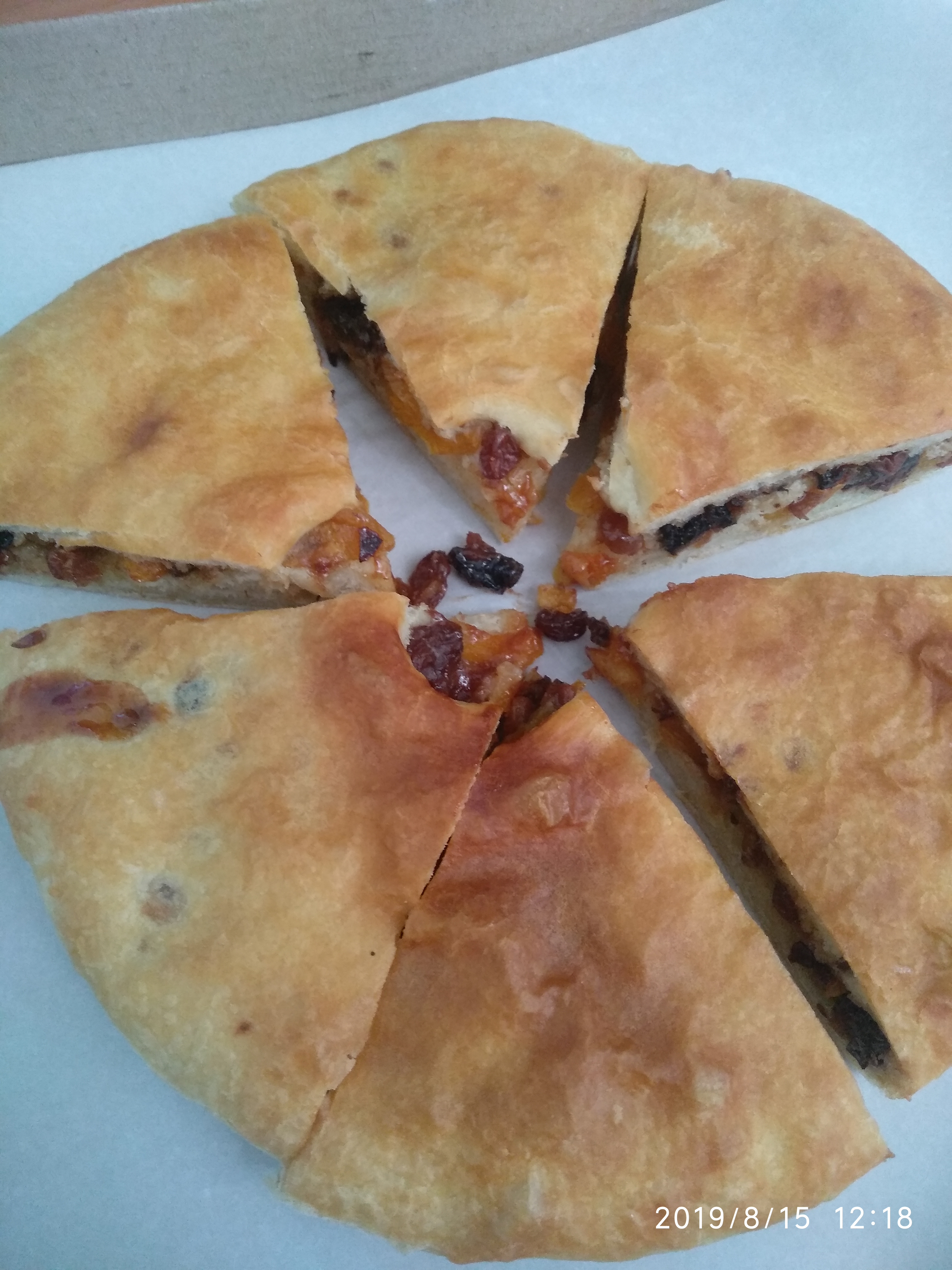 Закрытый пирог с сухофруктами и мягким ирисом 900 г: 21,63 р. 25,45 р. 1400 г: 28,42 р. 33,43 р. Состав: дрожжевое тесто, курага, чернослив, изюм, ирис, ванилин, сахарная пудра