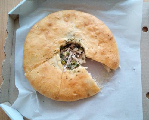 - закрытый пирог с сыром и зеленью (900 г): дрожжевое тесто, сулугуни, зеленый лук, укроп, соль, черный перец
