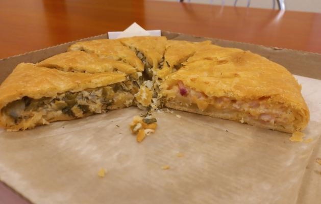 - закрытый пирог с сыром и зеленью (900 г): дрожжевое тесто, сулугуни, зеленый лук, укроп, соль, черный перец