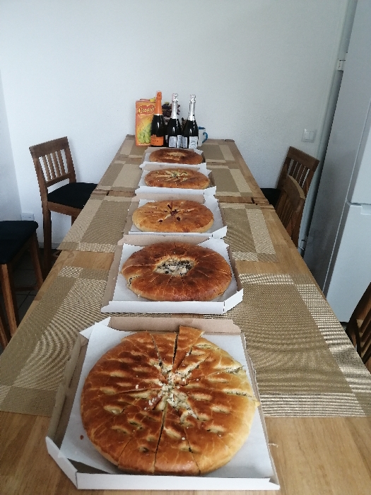 - закрытый пирог с творогом, сыром и чесноком (900 г): дрожжевое тесто, сулугуни, творог, яйца, чеснок, сливочное масло, соль, черный молотый перец