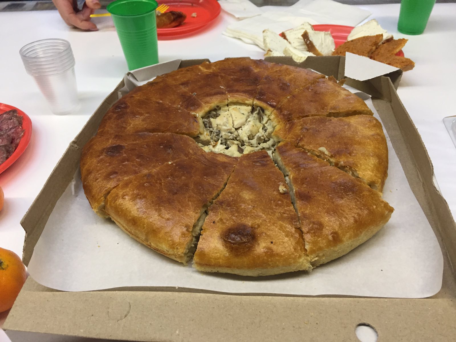 - закрытый пирог с курицей и грибами (900 г): дрожжевое тесто, филе курицы, соль, черный молотый перец, шампиньоны, сливочное масло