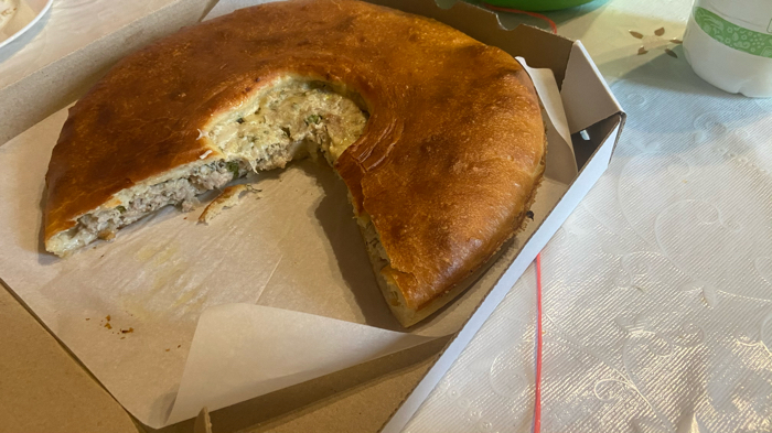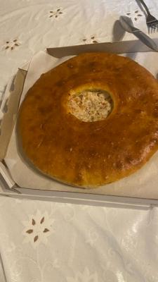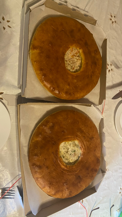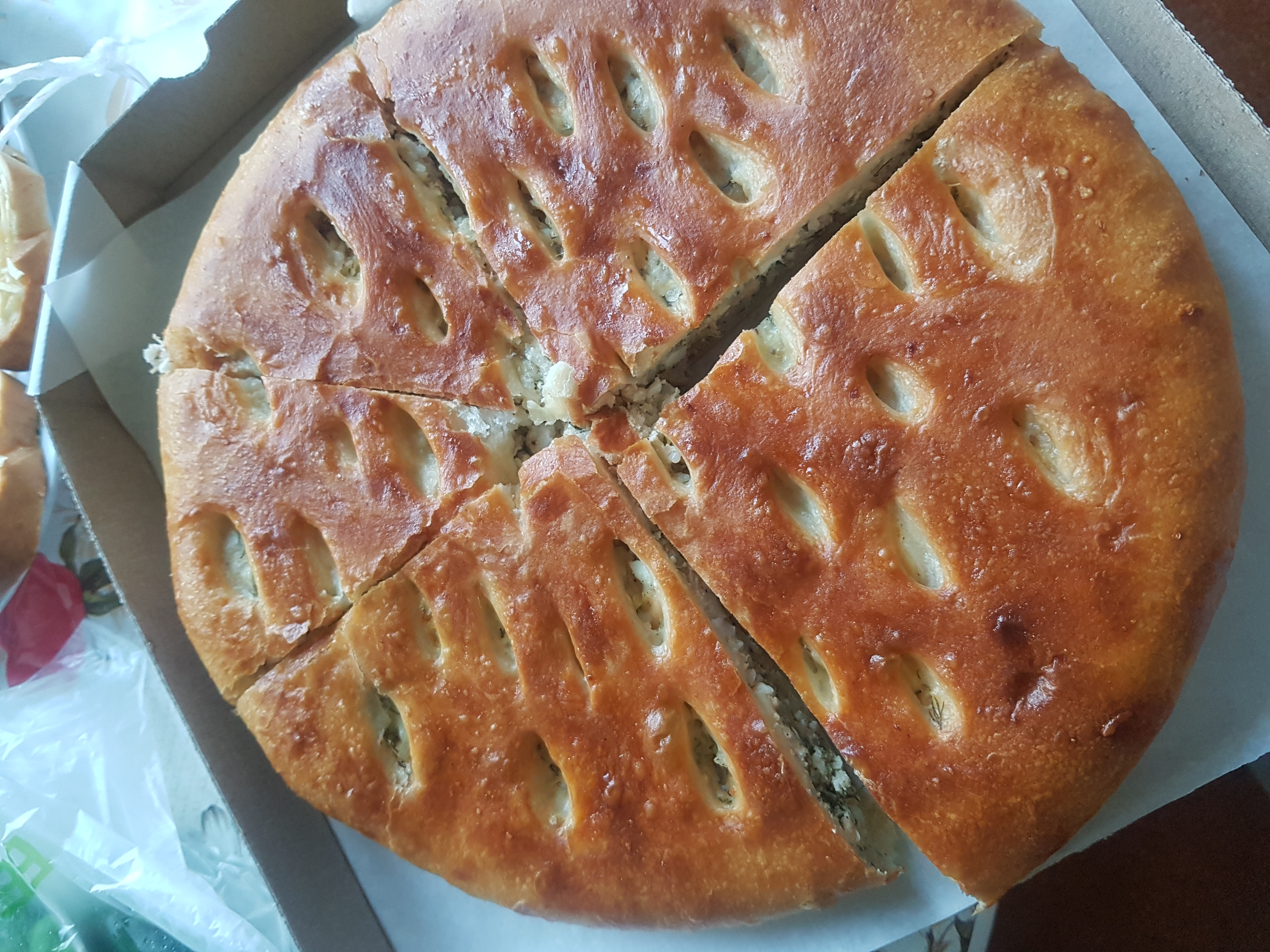- закрытый пирог с творогом, сыром и чесноком (900 г): дрожжевое тесто, сулугуни, творог, яйца, чеснок, сливочное масло, соль, черный молотый перец