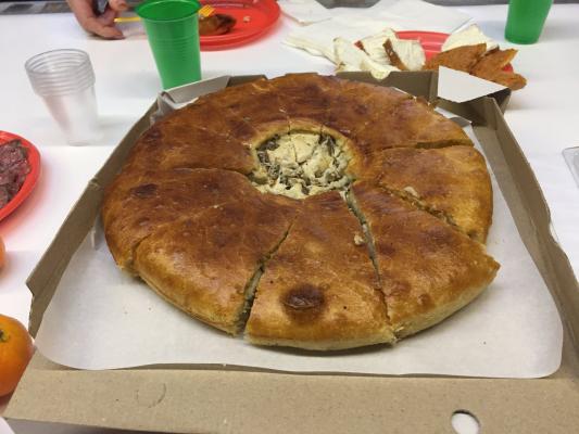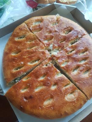 - закрытый пирог с сыром и зеленью (900 г): дрожжевое тесто, сулугуни, зеленый лук, укроп, соль, черный перец