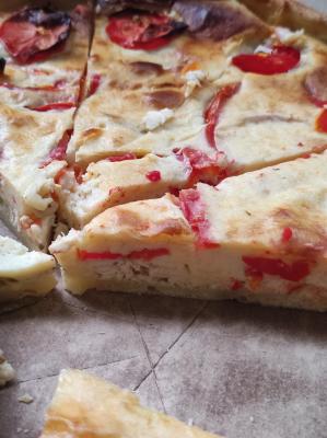 - Открытый пирог с лососем, томатом, розмарином, риккотой: фирменное песочное тесто, томат, фарш лосося, розмарин, творожный сыр, яйцо, сливки, чеснок, перец, соль