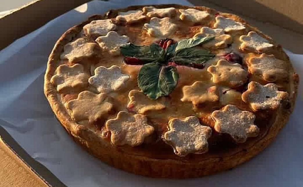 - Открытый пирог с яблоком, апельсином и корицей: фирменное песочное тесто, яблоко, апельсин, корица, сливки, сметана, творожный сыр, яйцо, сахар