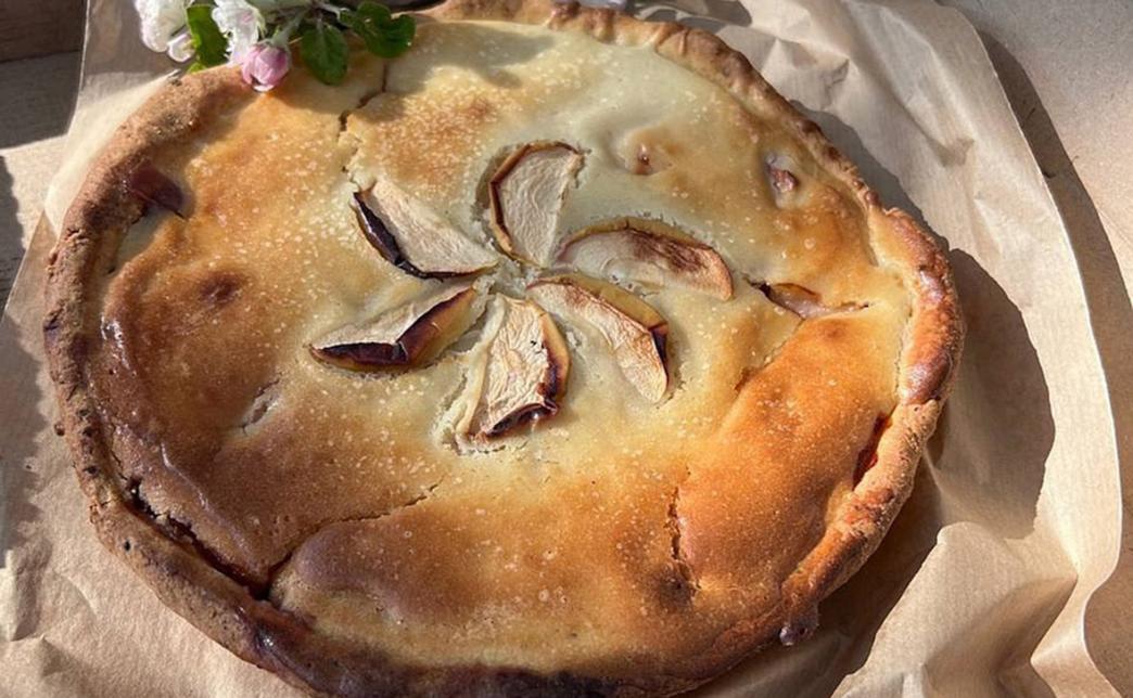 - открытый пирог с яблоком и корицей: фирменное песочное тесто, яблоко, корица, сливки, сметана, творожный сыр, яйцо, сахар
