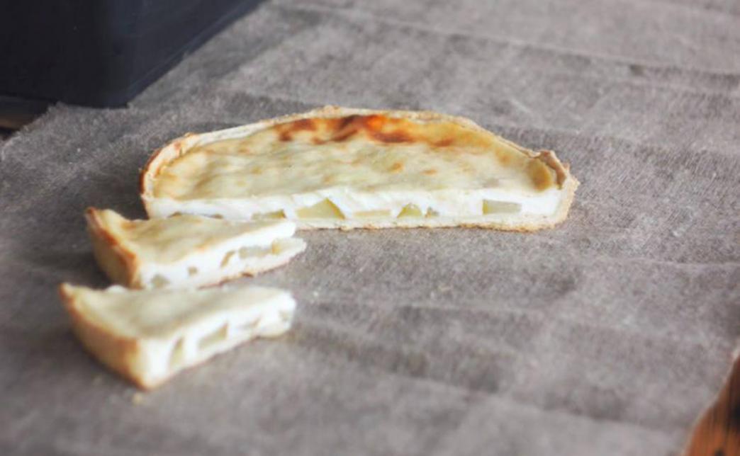 - открытый пирог с курицей, лук порей, томат: фирменное песочное тесто, грудка куриная , лук порей, томат, соль, перец, чеснок, яйцо, сыр творожный, сливки