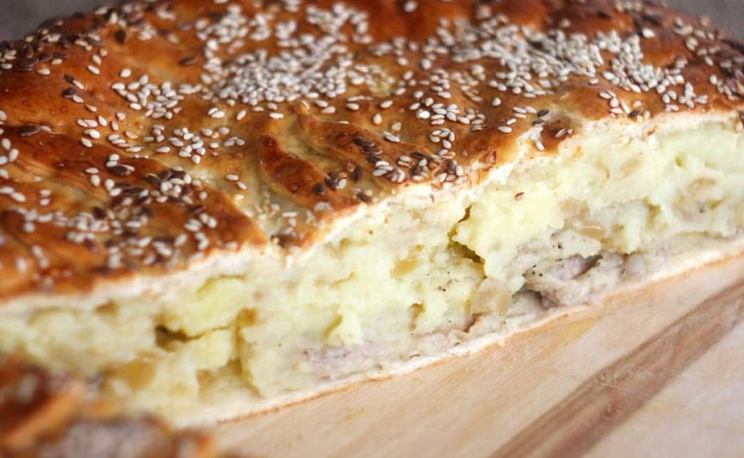 Состав: фирменное песочное тесто, говядина тушеная, картофель, морковь, лук маринованный, сливочный сыр, сметана, сливки, яйцо, соль, перец, чеснок