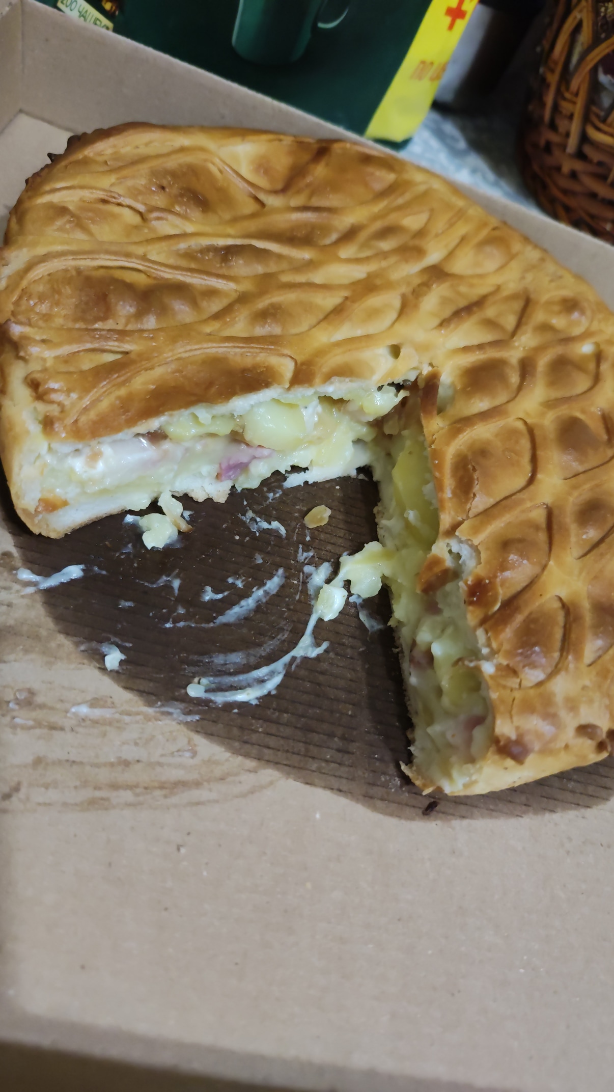 Состав: фирменное песочное тесто, говядина тушеная, картофель, морковь, лук маринованный, сливочный сыр, сметана, сливки, яйцо, соль, перец, чеснок