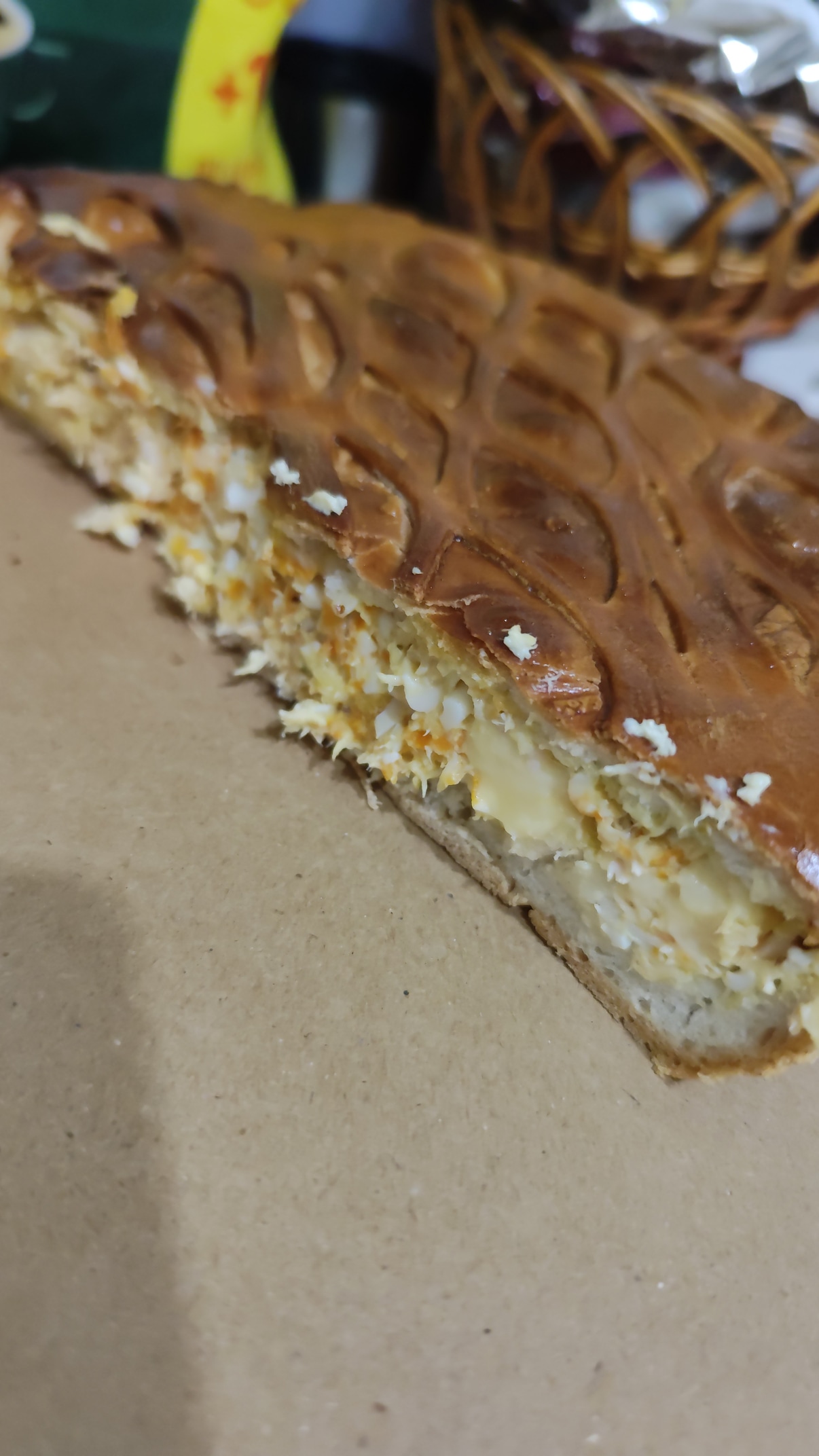 Состав: фирменное песочное тесто, куриная грудка, морковь, зеленый горошек, перец болгарский, сыр, сливки, яйцо