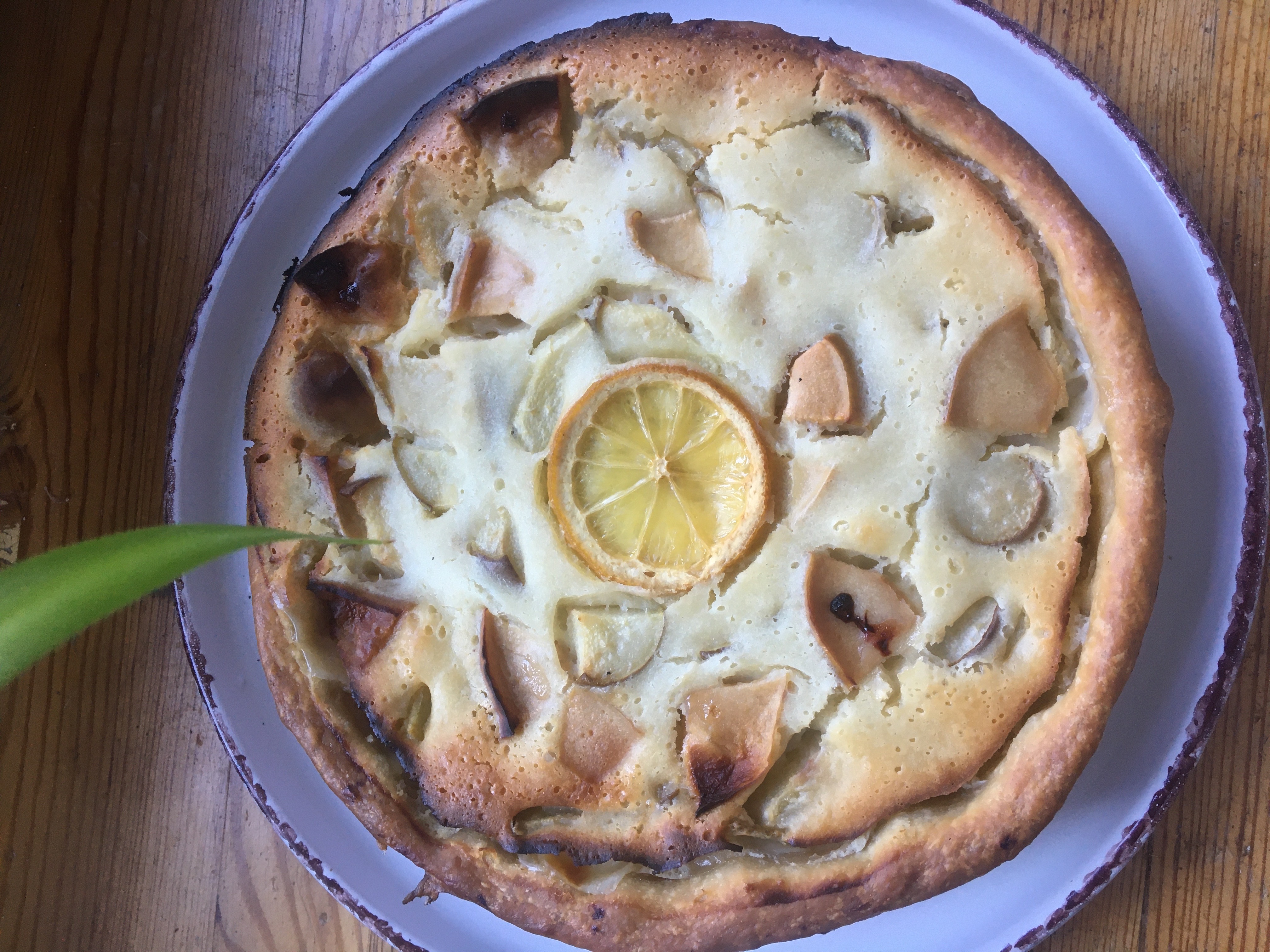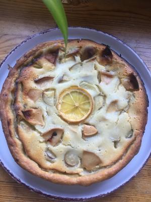 - открытый пирог с грушей и лимоном: фирменное песочное тесто, груша, лимон, сливки, сметана, творожный сыр, яйцо, сахар