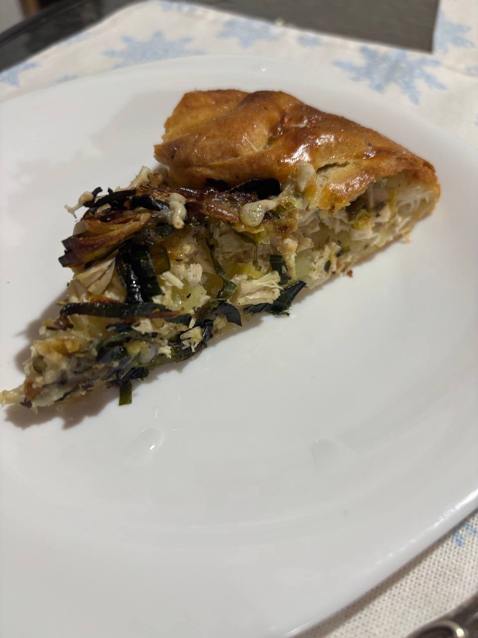 - открытый пирог с курицей, лук порей, томат: фирменное песочное тесто, грудка куриная , лук порей, томат, соль, перец, чеснок, яйцо, сыр творожный, сливки