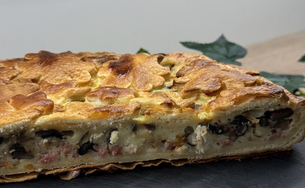- Лоранский пирог "С Ветчиной, Птицей и Шампиньонами" (1200 г): фирменное слоеное тесто, ветчина, филе курицы отварное, шампиньоны обжаренные, яйцо, сливки, творожный сыр, чеснок, соль, сахар, перец