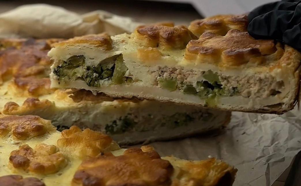 - Лоранский пирог "С лососем и брокколи" (1200 г): фирменное слоеное тесто, фарш лосося, брокколи, яйцо, сливки, творожный сыр, чеснок, соль, сахар, перец