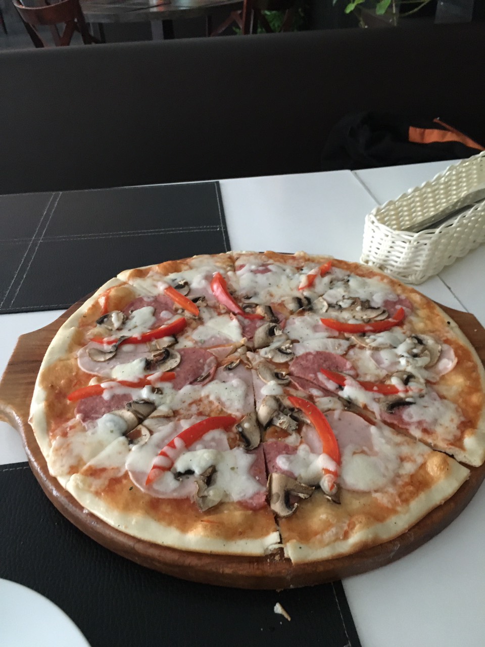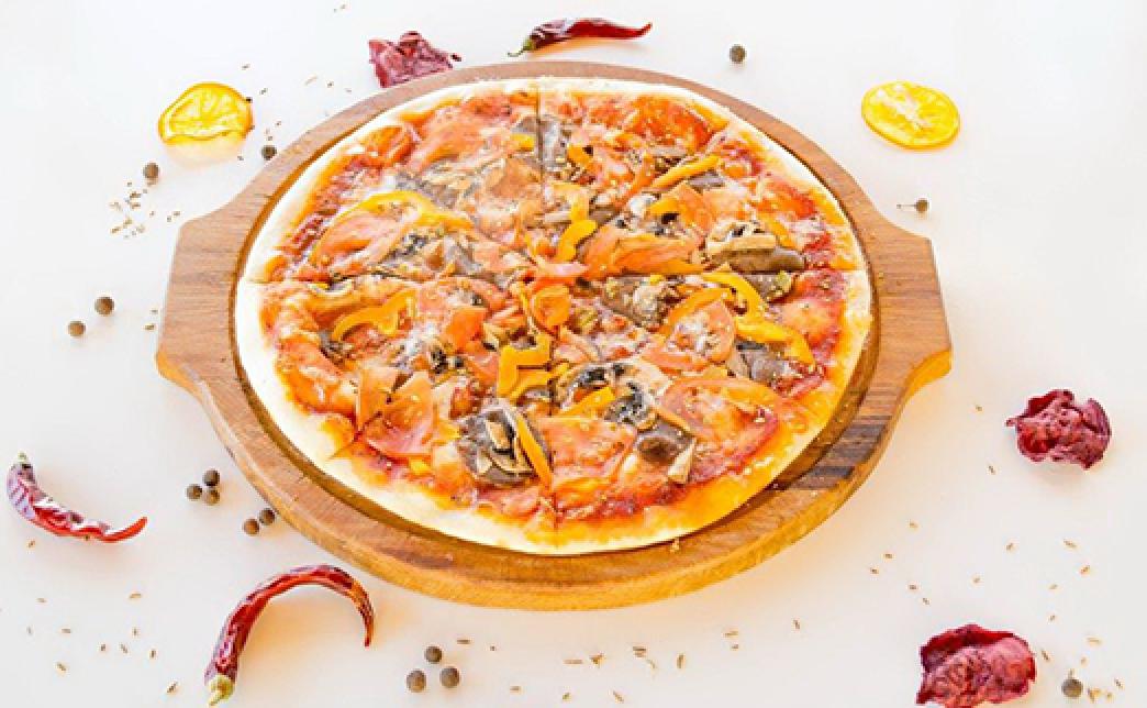 Пицца "Времена года" Тесто, соус, томаты св., сыр, ветчина к/в, перец св., грибы шампиньоны, орегано |