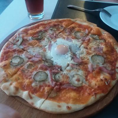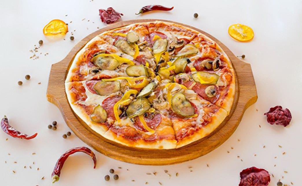 Пицца "Селянка" Тесто для пиццы, соус, сыр моцарелла, ветчина к/в, огурец мар, базилик, яйцо, чеснок |