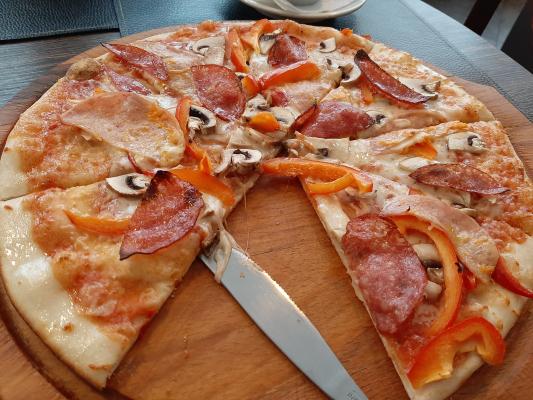 Пицца "Салями с грибами" Тесто для пиццы, соус, сыр моцарелла, чеснок, колбаса с/к, грибы шампиньоны, перец св. |