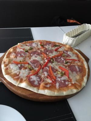 Пицца "Луизиана" Тесто, соус к пицце, сыр, ветчина, перец св., грибы шамп св., колбаса с/к, орегано |