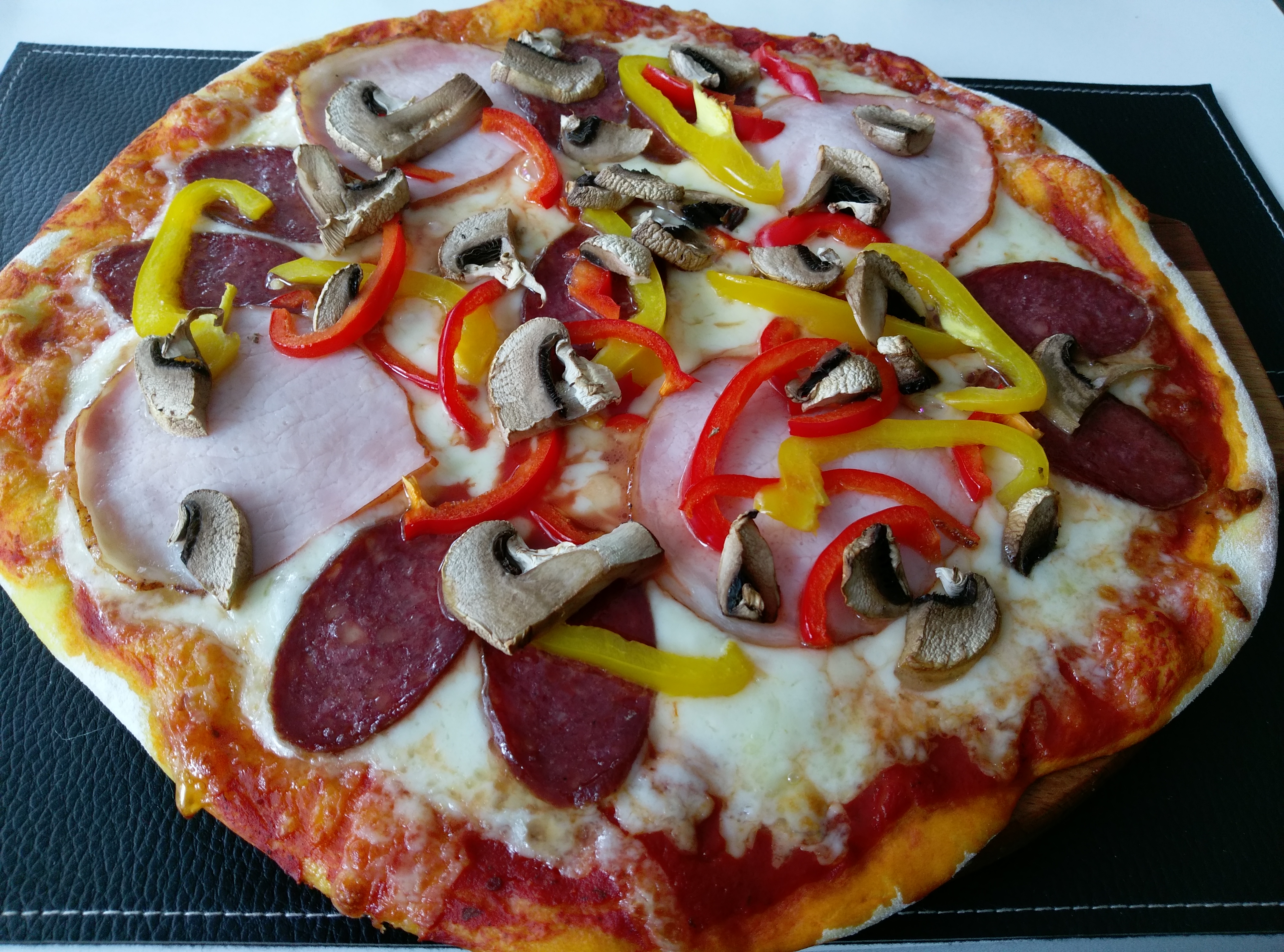 Тесто, соус к пицце, сыр, ветчина, перец св., грибы шамп св., колбаса с/к, орегано