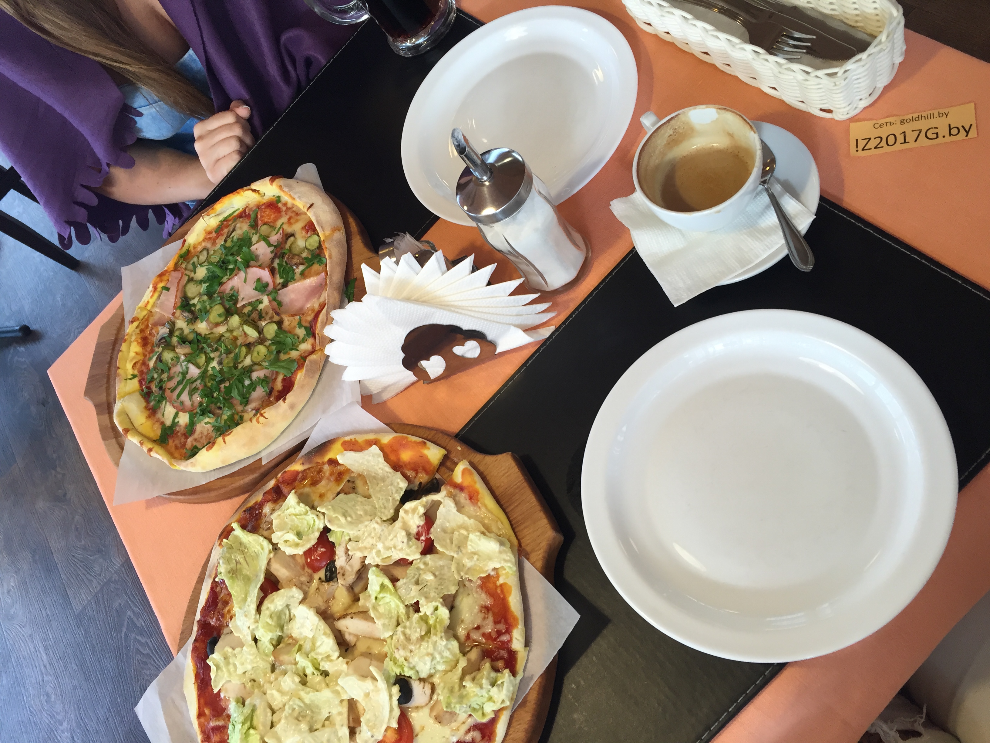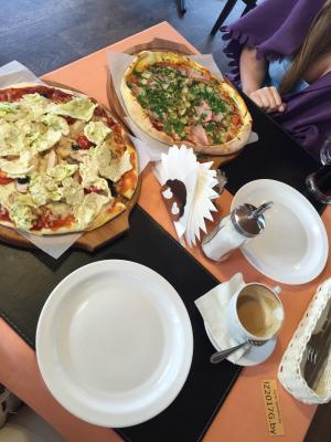 Были в кафе с подружкой ,пиццу готовили около 20минут , не ожидали что так много начинки ,не осилили ))очень вкусная) единственное ,подкорректируйте цены ,отличаются незначительно)