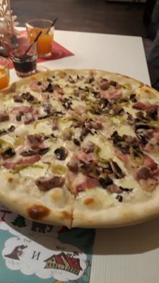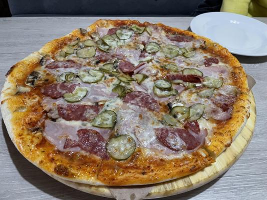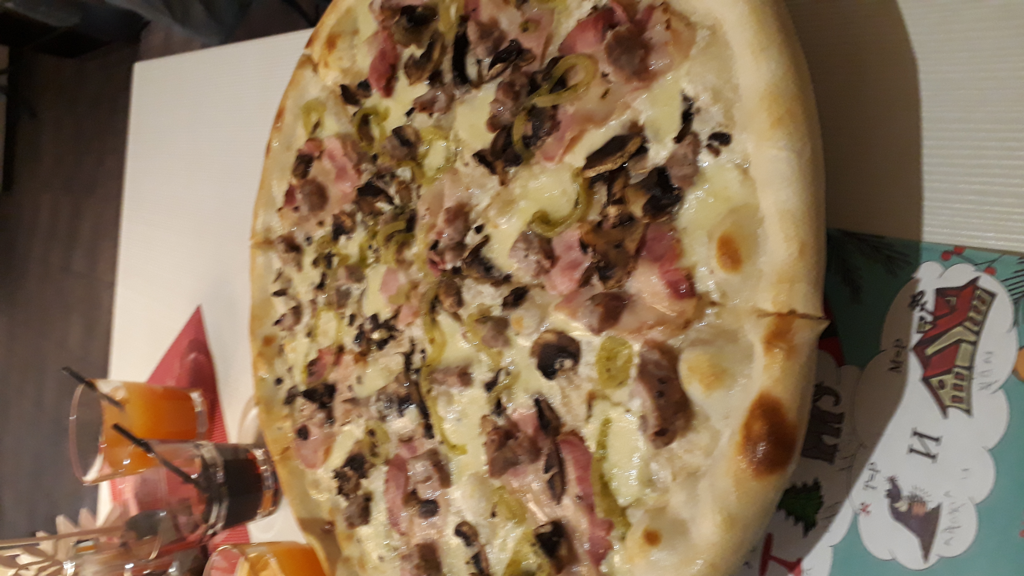 Состав: моцарелла, шампиньоны, ветчина, салями, бекон, маринованный огурец, розмариновое масло