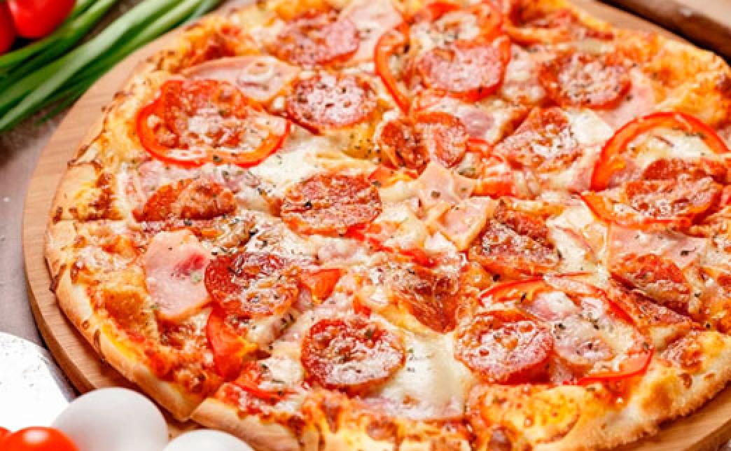 Состав пиццы: перец халапеньо, колбаса с/к, ветчина, лук красный, соус для пиццы, сыр моцарелла.