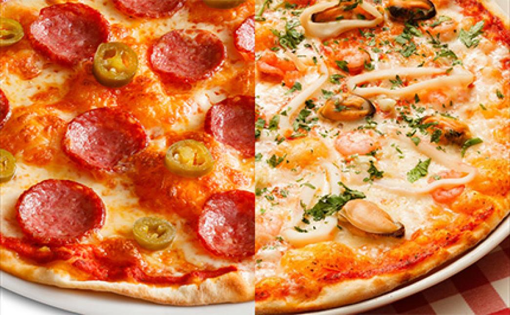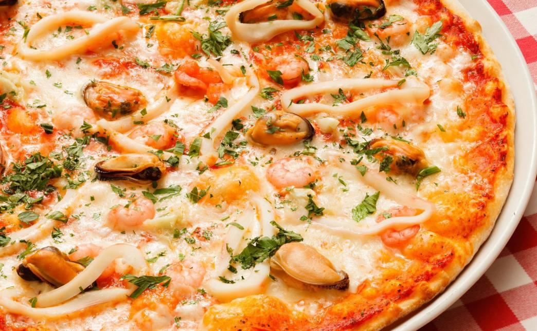 - С морепродуктами (385 г): соус, моцарелла, мидии,креветки, кальмар, перец, чеснок, петрушка: