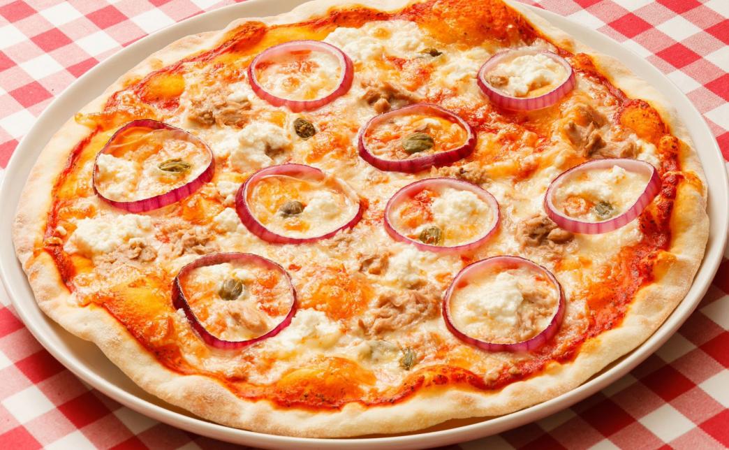 - Тонно (410 г): соус, моцарелла, тунец, лук красный, рикотта, каперсы: