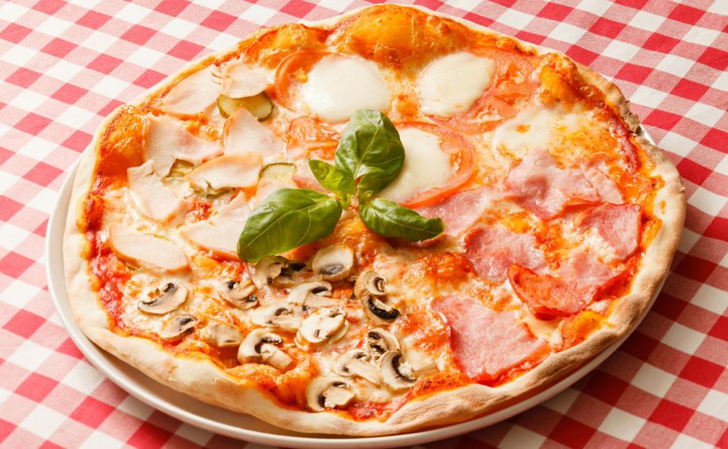 - Четриола (400 г): соус, моцарелла, ветчина куриная, шампиньоны, огурец маринованный, базилик сушеный: