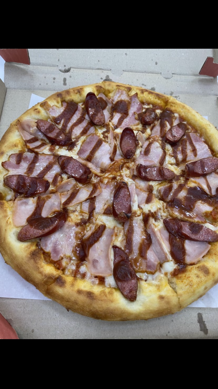 Состав: пицца-соус, моцарелла, колбаски охотничьи, пепперони, салями, курица, бекон, помидор, огурец маринованный, соус горчичный, соус барбекю, лук маринованный, сыр чеддер