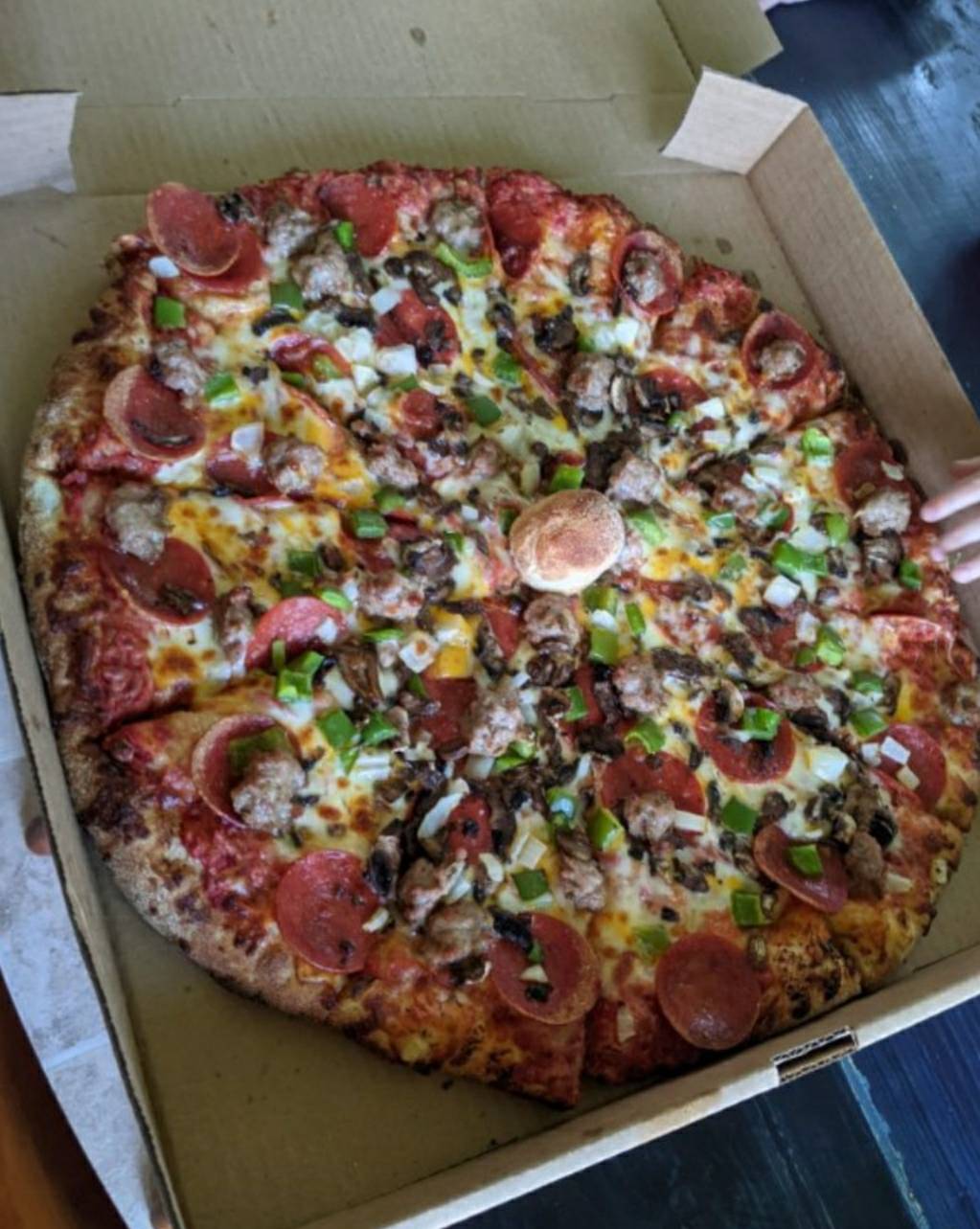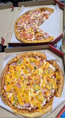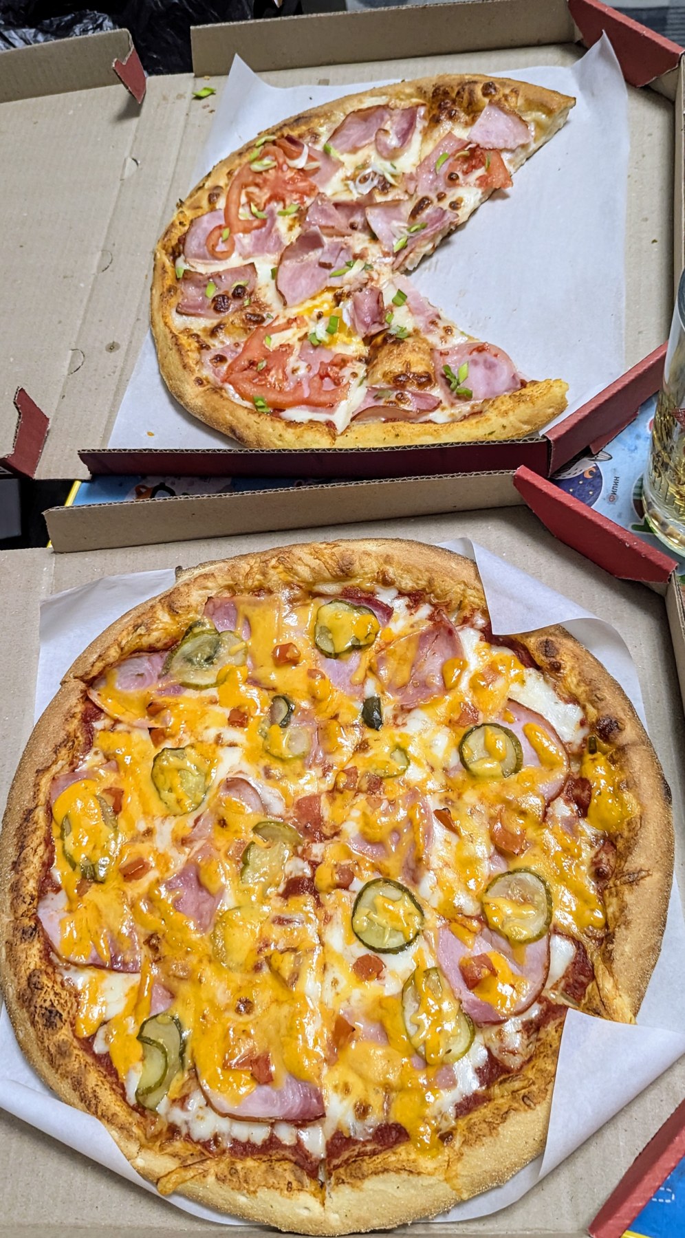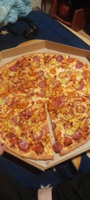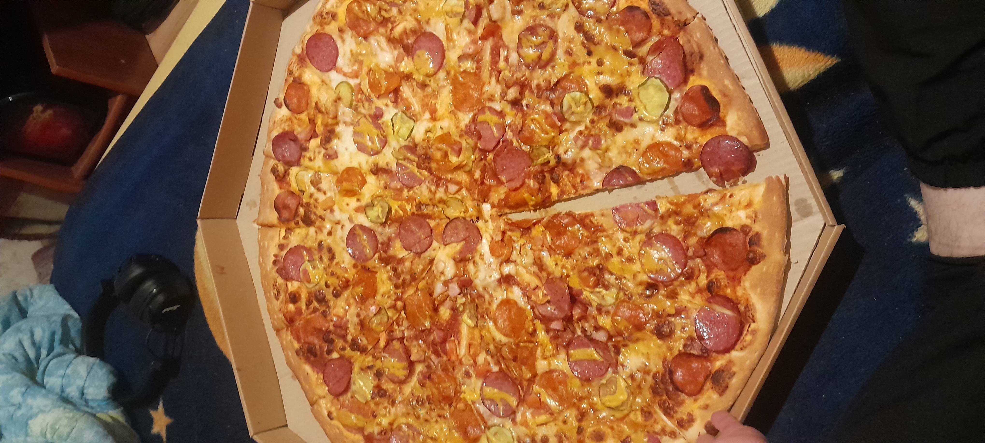 - мега-пицца "Компанейская" (60 см, 2000 г): моцарелла, пицца-соус, помидор, ветчина куриная, пепперони, бекон, лук маринованный, колбаски охотничьи, огурцы маринованные