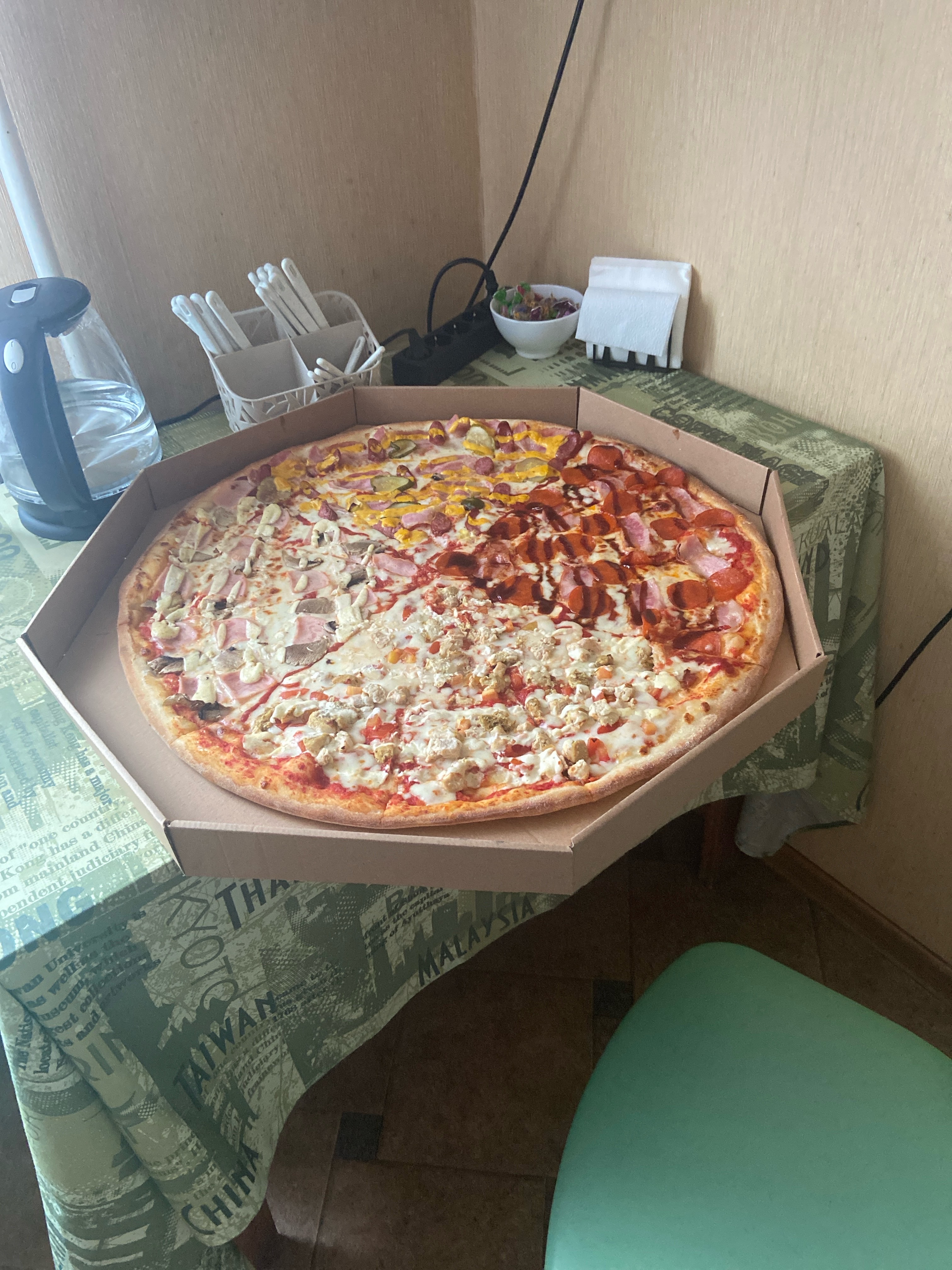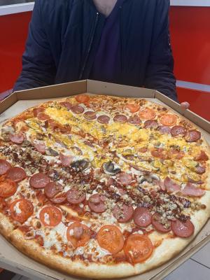 - мега-пицца "Восемь ломтиков" (60 см, 2000 г): моцарелла, ветчина, грибы, колбаски охотничьи, огурец, курица, помидор, пепперони, перец сладкий, салями, перец халапеньо