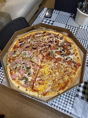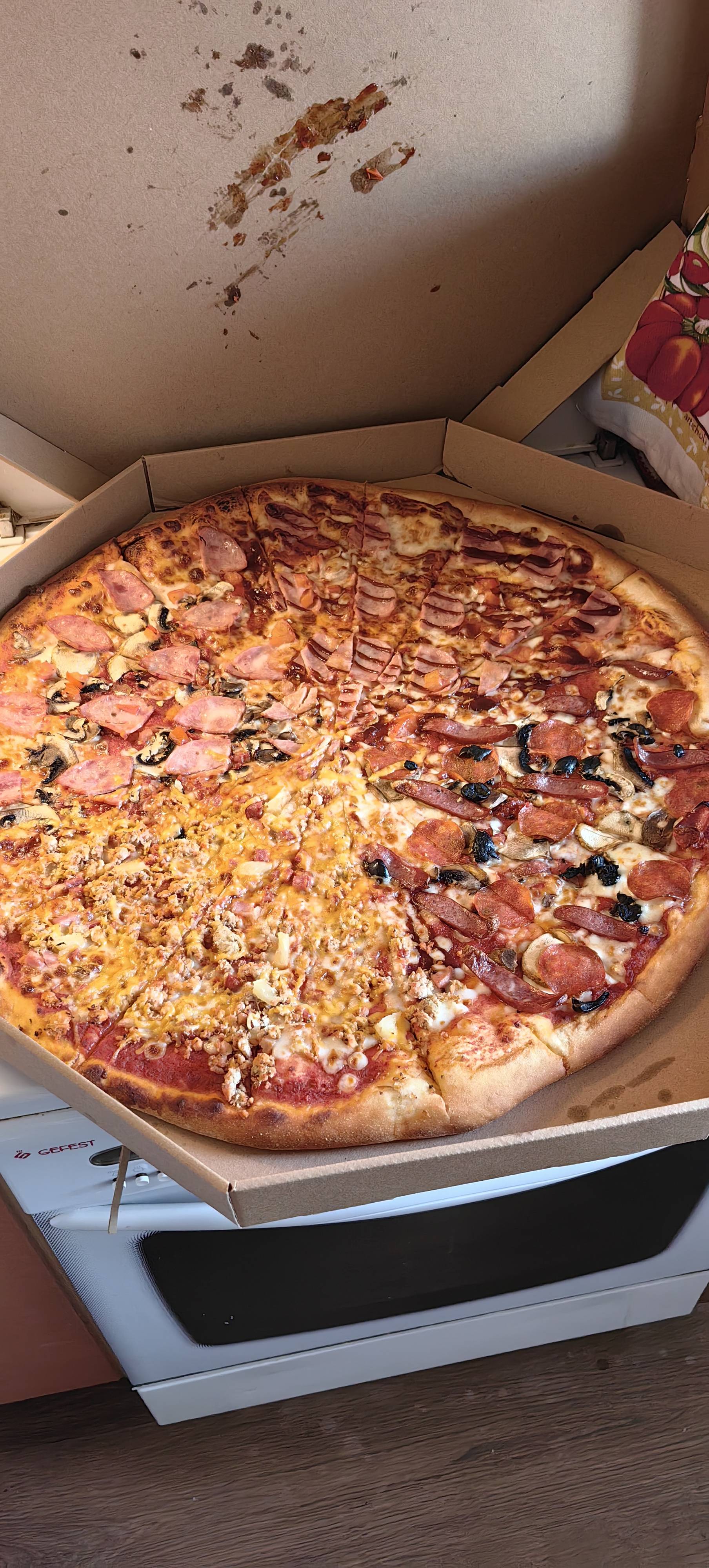 Состав: моцарелла, чесночный соус, кетчуп, ветчина, грибы, пепперони, курица, томат, фета