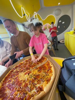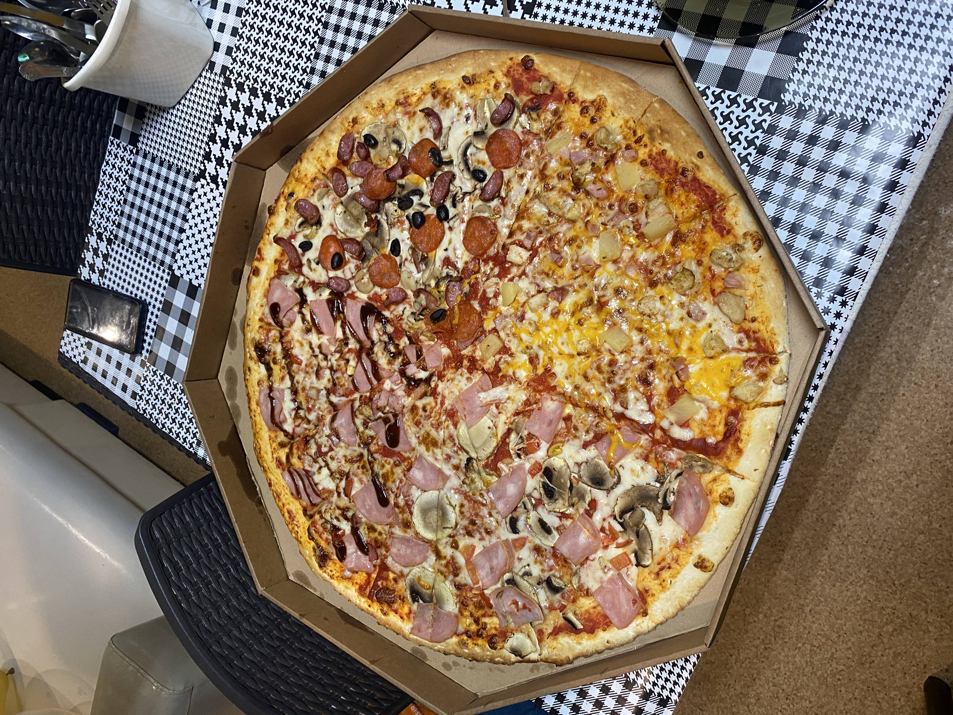 - мега-пицца "Семейная" (60 см, 2000 г): сыр моцарелла, помидор, салями, курица, огурец, ветчина, грибы, пепперони, сыр Чеддер