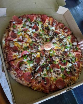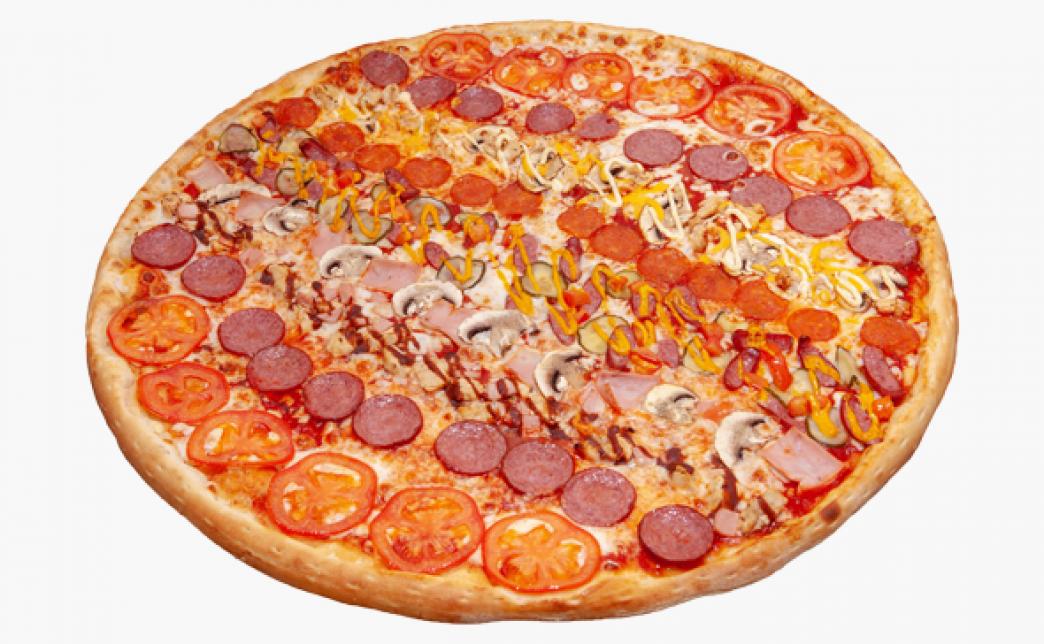 Состав: моцарелла, ветчина, грибы, колбаски охотничьи, огурец, курица, помидор, пепперони, перец сладкий, салями, перец халапеньо