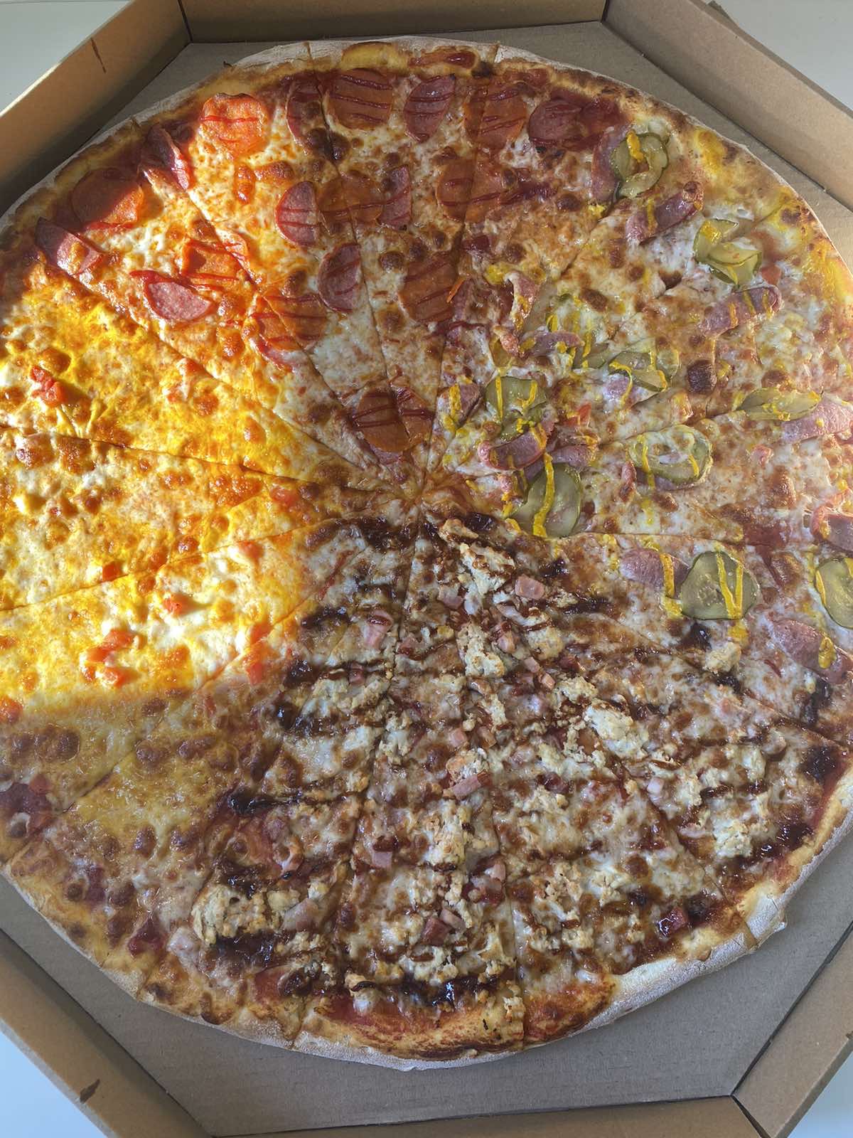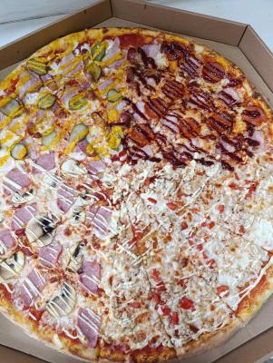 Состав: моцарелла, пицца-соус, ветчина, бекон, томат, огурец маринованный, чеддер, соус бургер