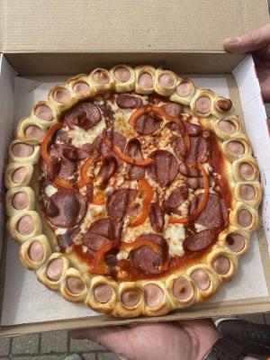 Состав: пицца-соус, моцарелла, колбаски охотничьи, пепперони, салями, курица, бекон, помидор, огурец маринованный, соус горчичный, соус барбекю, лук маринованный, сыр чеддер