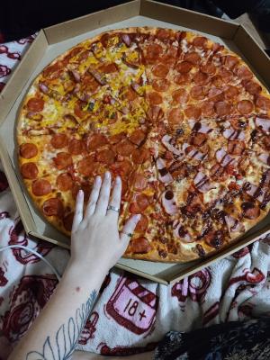 - мега-пицца "Компанейская" (60 см, 2000 г): моцарелла, пицца-соус, помидор, ветчина куриная, пепперони, бекон, лук маринованный, колбаски охотничьи, огурцы маринованные