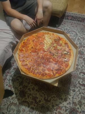 - мега-пицца "Компанейская" (60 см, 2000 г): моцарелла, пицца-соус, помидор, ветчина куриная, пепперони, бекон, лук маринованный, колбаски охотничьи, огурцы маринованные