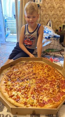 - мега-пицца "Семейная" (60 см, 2000 г): сыр моцарелла, помидор, салями, курица, огурец, ветчина, грибы, пепперони, сыр Чеддер