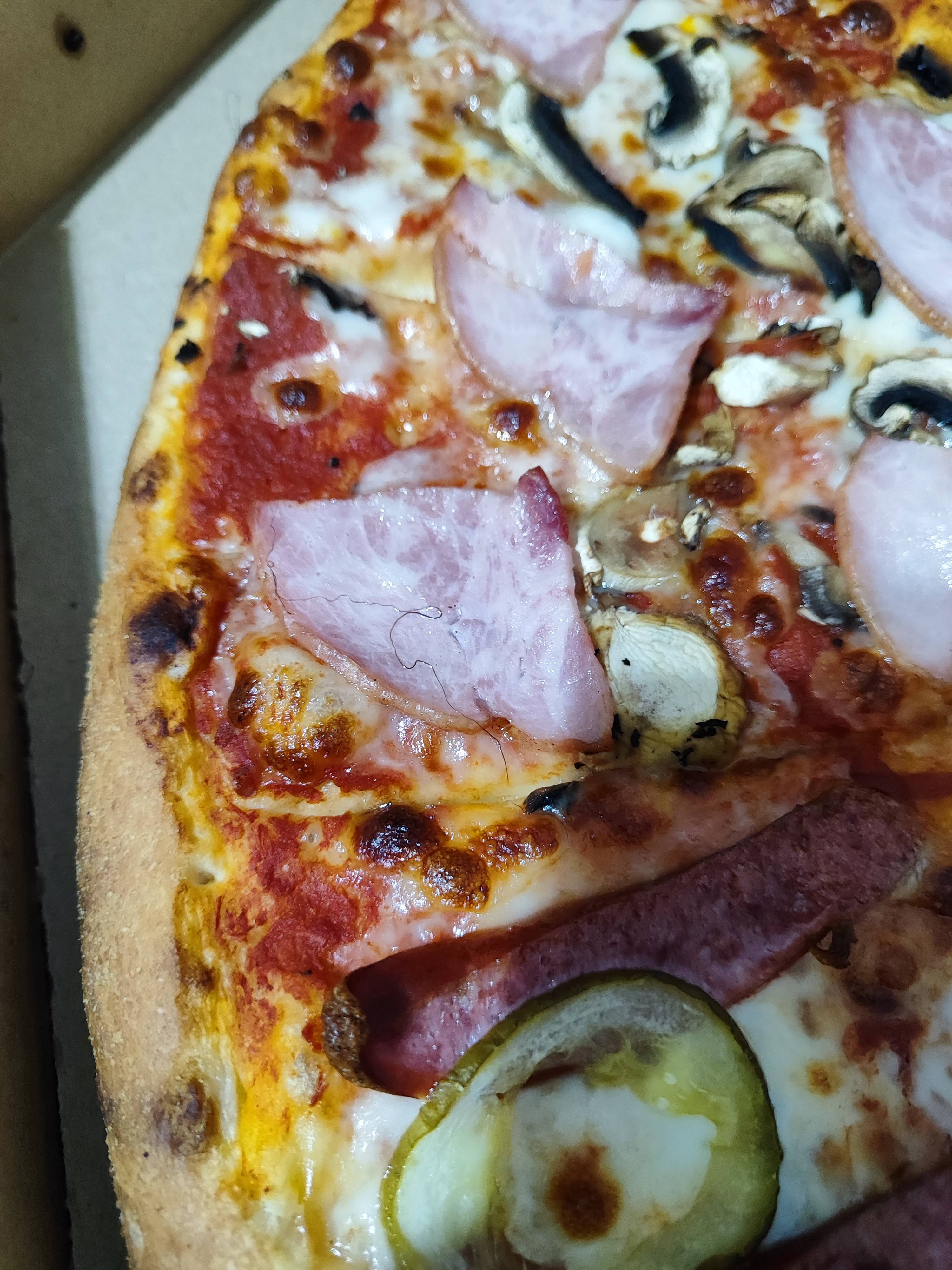 Состав: моцарелла, пицца-соус, ветчина, бекон, томат, огурец маринованный, чеддер, соус бургер