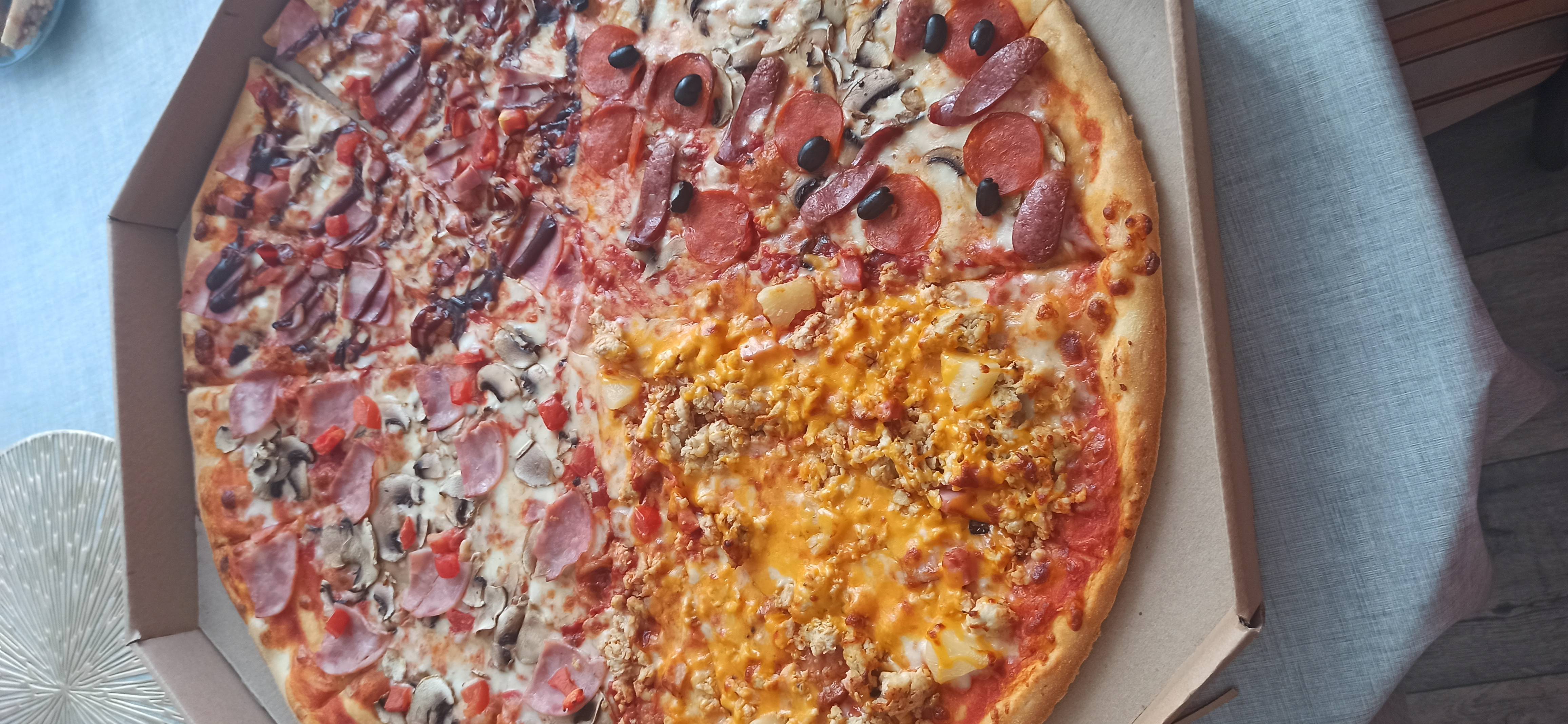 - мега-пицца "Компанейская" (60 см, 2000 г): моцарелла, пицца-соус, помидор, ветчина куриная, пепперони, бекон, лук маринованный, колбаски охотничьи, огурцы маринованные
