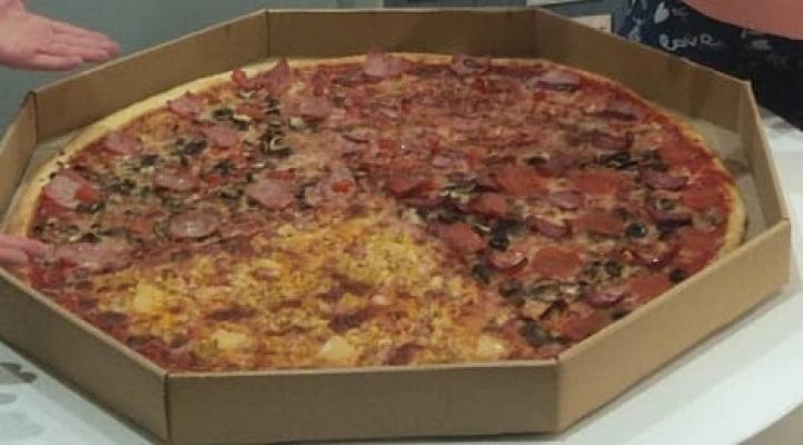 - мега-пицца "Семейная" (60 см, 2000 г): сыр моцарелла, помидор, салями, курица, огурец, ветчина, грибы, пепперони, сыр Чеддер